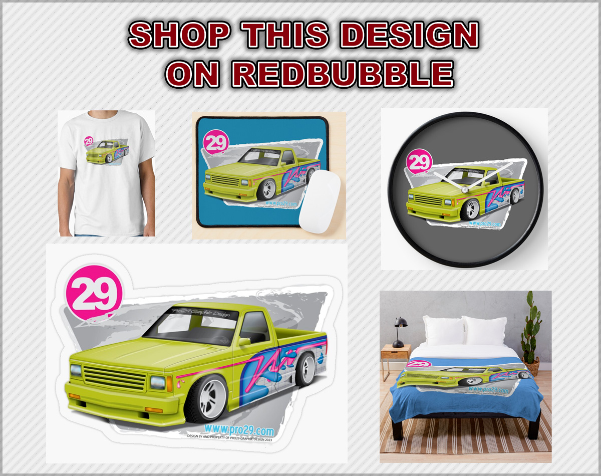 Illustration of a lowrider S10 style mini truck with custom graphics and slammed with a body kit / ground effects