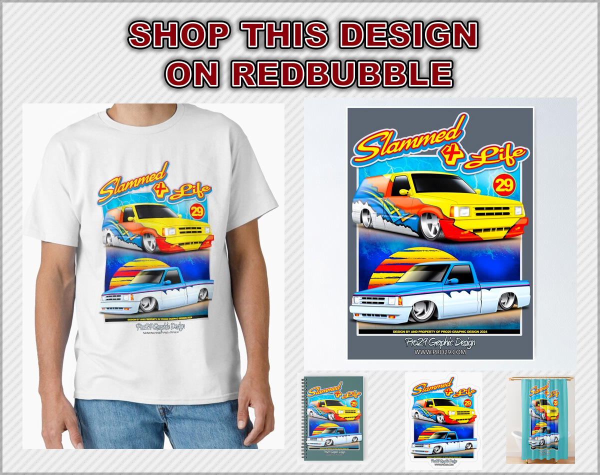 Illustration of two Mazda B-Series style lowrider mini trucks with the words Slammed 4 Life
